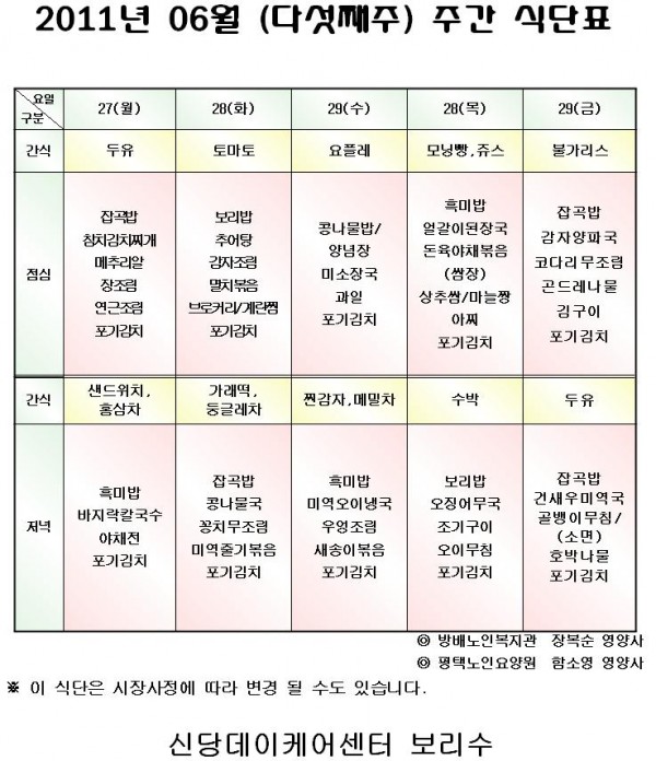 2011년 6월 다섯째주 식단 페이지 정보 작성자 신당데이케어센터 작성일11-06-27 조회13,558회 댓글0건 관련링크 이전글 다음글 목록 본문 2011년 6월 다섯째주 식단 댓글목록 등록된 댓글이 없습니다. 이전글 다음글 목록